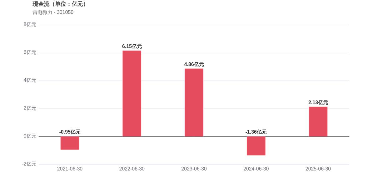 在经营稳健性方面,雷电微力面临存货周转效率明显下降的挑战,存货周转天数为974.55天,较2024年上半年增长了282.24%,表明公司存货管理效率有待提升。经营活动产生的现金流净额为2.13亿元,相比2024年同期的-1.36亿元,实现了由负转正。此外,2025年上半年的资产负债率为23.17%,同比下降了3.10个百分点,这意味着公司负债总额占资产总额的比重在减少。