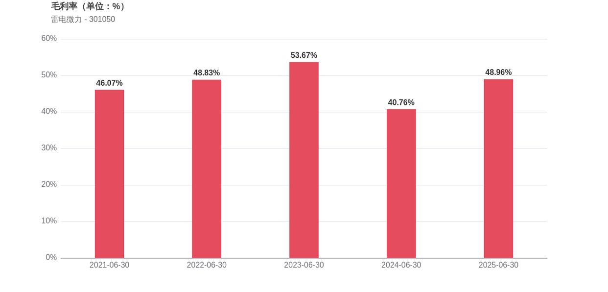 从反映盈利质量的指标来看,雷电微力净利率由2024年上半年的29.73%下滑至25.15%,下降了4.58个百分点,已连续3年同期下滑,净资产收益率为3.79%,同比下降了3.89个百分点,已连续4年同期下滑,不过毛利率从2024年上半年的40.76%提升至48.96%,上升了8.20个百分点。