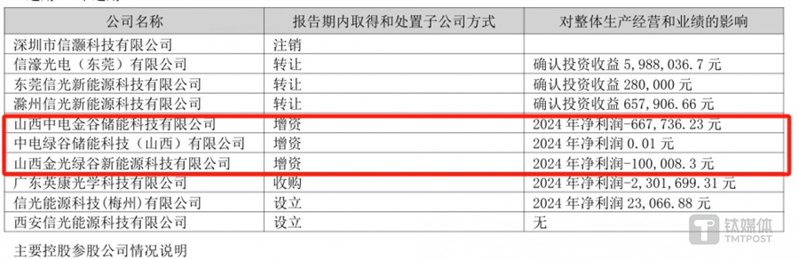需要注意的是,信濠光电并未完全放弃光储业务。2024年,信濠光电通过增资的方式,合计取得三家公司各50.98%的股权,累计增资金额为9360万元。这三家公司与安徽信光的业务范围有一定差别,主要业务范围围绕储能电站展开。但三家公司的盈利能力较为平庸,仅有一家公司盈利0.01元,其余两家公司分别亏损66.77万元和10.00万元。