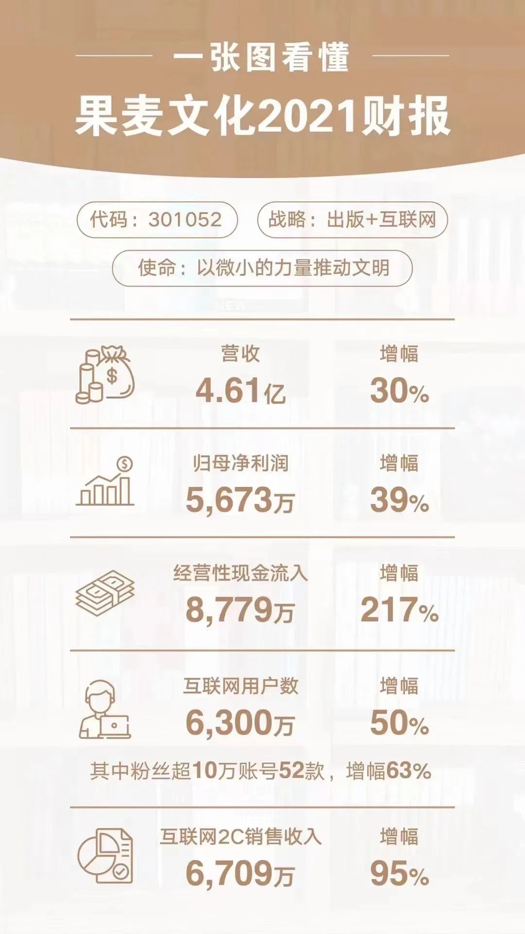 自2021年8月30日果麦文化传媒股份有限公司(以下简称“果麦文化”)于深圳证券交易所上市后,行业就一直在期待他们交出自己的成绩单。