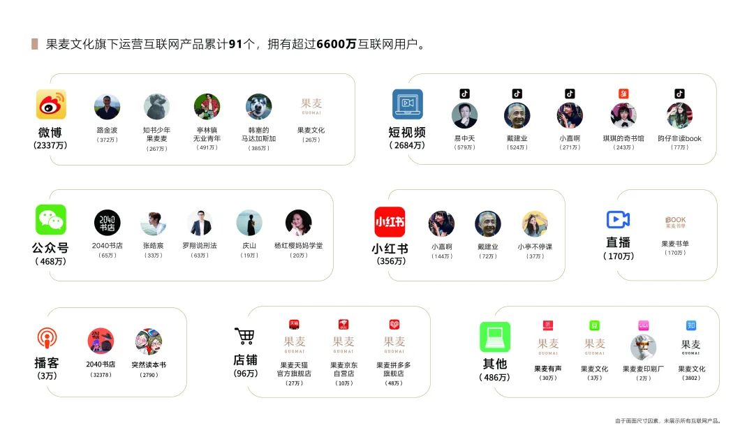 据招股书显示,后疫情时代果麦文化之所以连续两年保持高速增长均得益于“出版+互联网”的商业模式,通过互联网连接用户、营销销售产品以及用互联网反驱内容的研发迭代。作为一家图书公司,果麦文化自2012年成立之初便积极拥抱网络新媒体、新技术,截至2021年12月31日,果麦文化运营的互联网产品账号超过70款,包括微博账号“知书少年果麦麦”、“果麦文化”等,抖音账号有“果麦书单”、“小嘉啊”、“戴建业”、“刘同”等;快手账号有“琪琪的奇书馆”、“小亭不停课”等;微信公众号有“2040书店”、“易中天”、“罗翔说刑法”、“张皓宸”、“榕榕姐姐读童书”、“庆山”、“杨红樱”等,其中超10万粉丝的新媒体平台账号由2020年底的32款增至2021年的52款,建立并完善了涵盖公司、作者及知名媒体人账号的互联网产品矩阵。