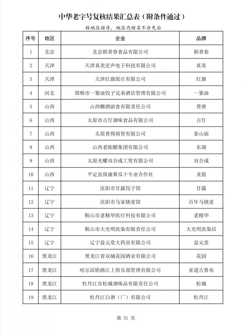 根据《中华老字号示范创建管理办法》(以下简称《办法》),坚持“优中选优”的工作原则,实施“有进有出”的动态管理,商务部、文化和旅游部、市场监管总局、国家知识产权局、国家文物局联合对已有中华老字号开展复核。经企业自查、地方初核、专家评审、社会公示等工作程序,确定了复核结果。日前,商务部公布了《关于公布中华老字号复核结果的通知》。