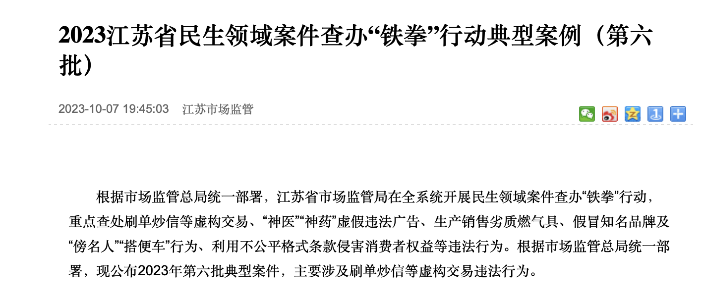 近期,江苏省市场监管局也公布了10起包含刷单炒信等不正当竞争案件,涉案的企业和商家中,有的组织人员大规模“刷单”造假,有的委托刷手虚构交易记录。