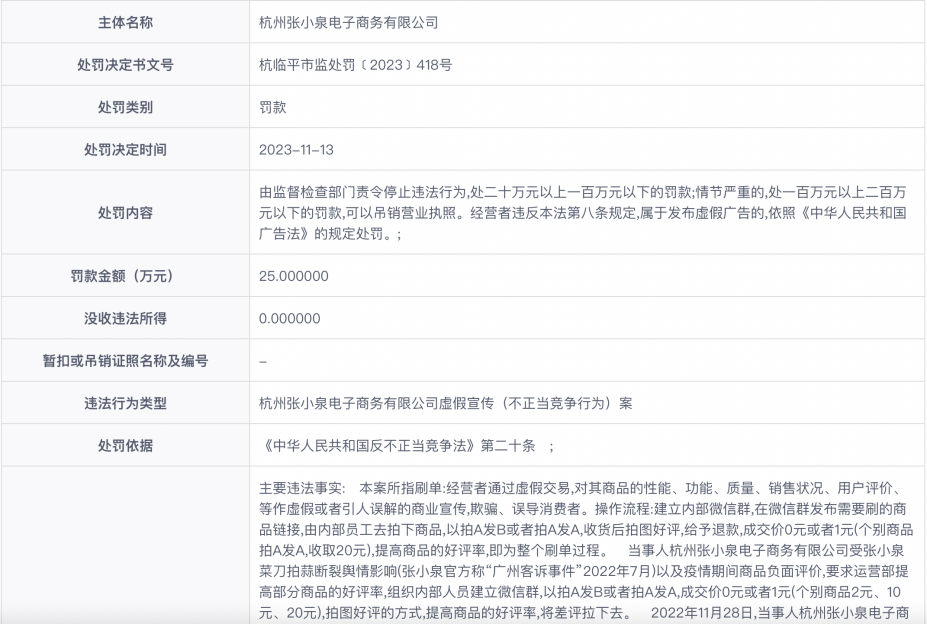 近日,信用中国网站更新了一则行政处罚信息,当事人为张小泉全资子公司杭州张小泉电子商务有限公司(以下简称“张小泉电子商务”)。信息显示,当事人组织内部人员建立微信群,以拍A发B或者拍A发A,成交价0元或者1元,通过拍图好评的方式,提高商品的好评率,将差评拉下去。