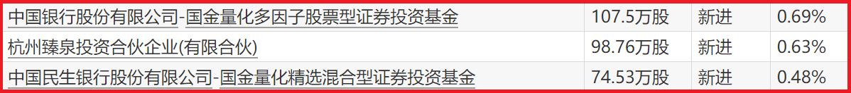 张小泉2024年1月31日披露前十大股东最新持股情况显示,截至1月26日,与最近定期报告持股数相比,3个机构新进为前十大股东,分别是国金量化多因子基金、杭州臻泉投资合伙企业(有限合伙)、国金量化精选基金,持股数量分别为107.50万股、98.76万股、74.53万股。