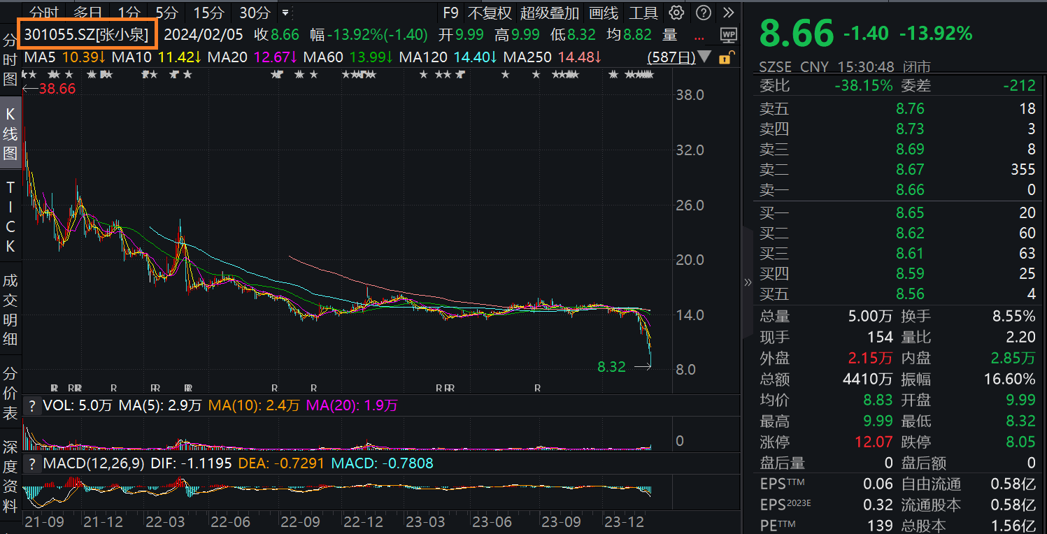 2024年2月5日,张小泉以下跌13.92%报收8.66元,盘中最低跌至8.32元,这一价格是该公司自2021年9月6日上市至今的最低价格。