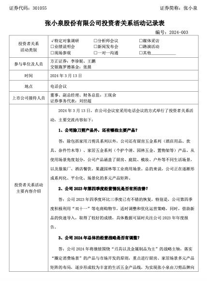投资者关心,公司2023年第四季度经营情况是否有所改善?张小泉回答:公司2023年四季度环比三季度已有不错的恢复,特别是,公司第四季度积极利用“双十一”等电商购物节,适时调整和优化运营策略,同时,借助新品的快速导入,取得了较好的成绩,具体数据可届时关注公司2023年年度报告。