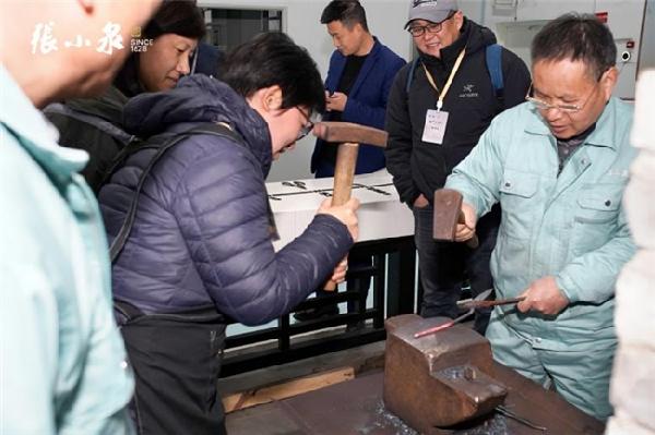在张小泉核心管理团队的陪同下,安泰校友们深度走访了张小泉刀剪教科基地和工厂车间,详细了解了企业的发展历史、文化、生产工艺以及产品研发等方面的内容,感受到了张小泉的精湛技艺与独特魅力,许多嘉宾对张小泉的企业文化和产品都表示认同和喜爱。在生产车间,嘉宾近距离观看了非遗匠师们手工锻打剪刀的过程,深入了解了张小泉企业对非遗锻制技艺的保护与传承,并对这一技艺表现出极高的兴趣和由衷的赞叹。
