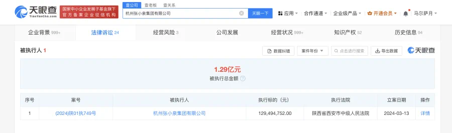 “刀剪第一股”张小泉及其控股股东等新增一则被执行人信息,涉及执行金额超过1.29亿元人民币。
