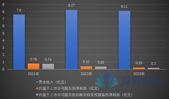 2023年,张小泉实现营业收入约8.11亿元,同比下滑1.82%;归属于上市公司股东的净利润约2511.83万元,同比下滑39.48%;归属于上市公司股东的扣除非经常性损益的净利润约2026.66万元,同比下滑42.69%。公司净利润、扣非后净利润已连续两年大幅下滑。