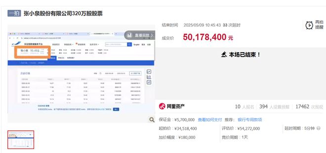 5月8日至9日期间,张小泉集团公开拍卖持有的公司320万股股份。竞拍结果显示,自然人杨涛于5月9日10时45分,通过公开竞价以最高应价成功竞得标的股权,最终拍卖成交价为5017.84万元。