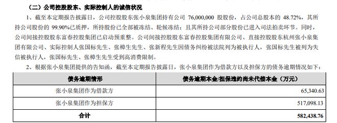 而张小泉集团作为借款人涉及的融资业务共有8笔产生逾期,债务逾期本金合计6.53亿元。张小泉集团以其所持公司股份质押担保对应的融资业务中有6笔已逾期,担保违约尚未代偿本金合计5.56亿元。张小泉集团对外提供保证担保对应的融资业务中,担保违约尚未代偿本金合计46.15亿元,合计债务逾期58.24亿元。