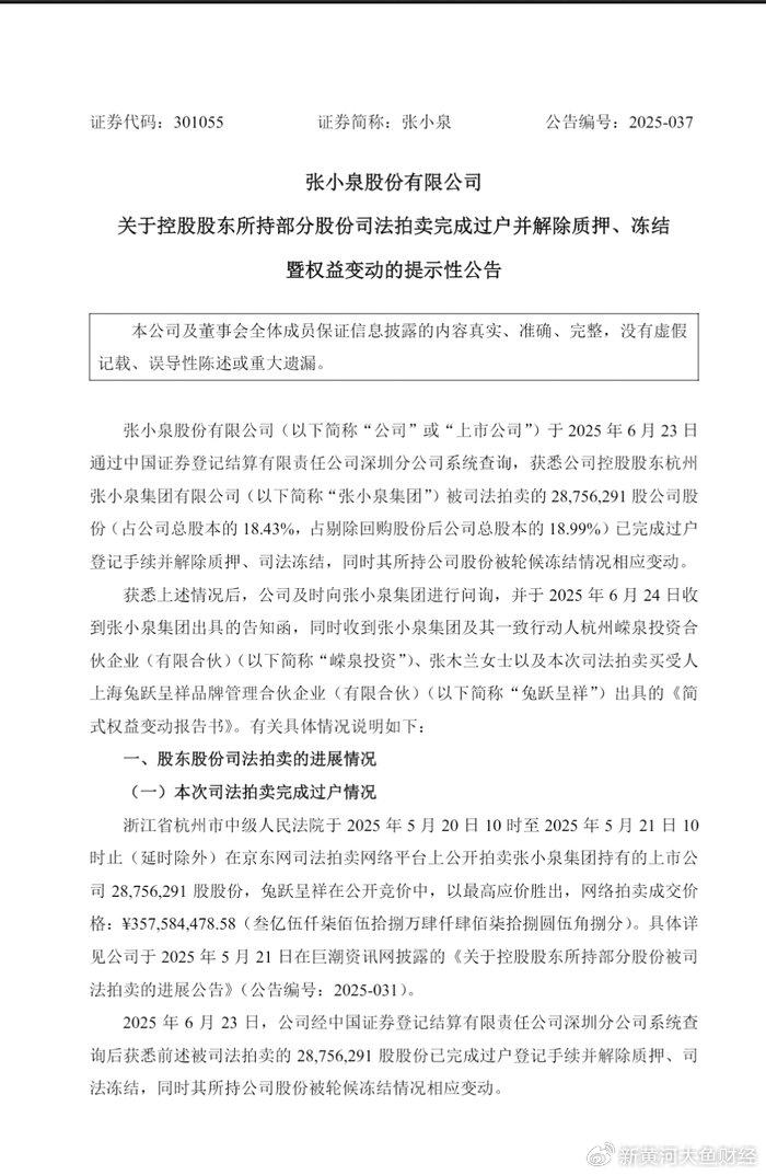 兔跃呈祥正是通过司法拍卖入局,据报道,其以3.58亿元竞得张小泉约2876万股份,按最新股价估算,其投资已浮盈约2亿元。