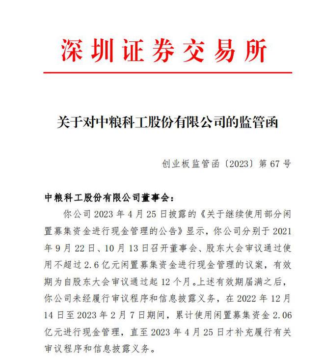 深交所表示,上述行为违反了《创业板股票上市规则(2023 年修订)》第1.4条和《上市公司自律监管指引第2号——创业板上市公司规范运作》第6.3.5条第一款第二项的规定。深交所要求中粮科工公司董事会充分重视上述问题,吸取教训,及时整改,杜绝上述问题的再次发生。