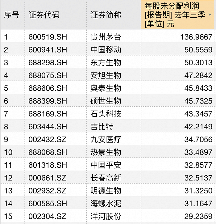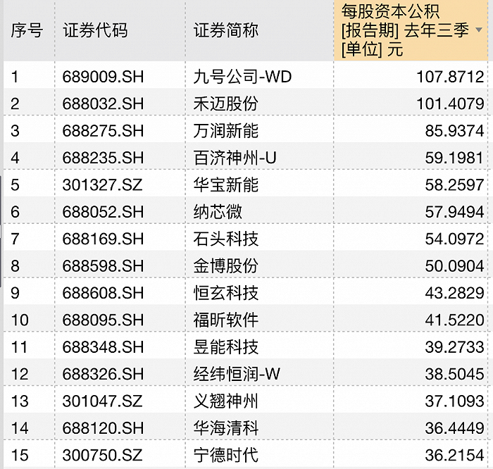 根据Wind数据,截至2022年三季度末,每股未分配利润排名第一的依然是贵州茅台(600519.SH),达到136.9667元;中国移动(600941.SH)和东方生物(688298.SH)位列二、三,分别为50.5559元和50.30元。看每股资本公积的话,截至2022年三季,排名靠前的则是九号公司(689009.SH),为107.87元,紧随其后的是禾迈股份(688032.SH),为101.4079元,万润新能(688275.SH)也有85.94元,其他如百济神州(688235.SH)、华宝新能(301327.SZ)、纳芯微(688052.SH)、石头科技(688169.SH)、金博股份(688598.SH)等,也都超过了50元。那么,这些公司当中,是否会有高送转的计划在酝酿?