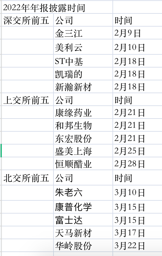 这之后2月10日有美利云(000815.SZ)、2月18日有ST中基(000972.SZ)、凯瑞德(002072.SZ)、新瀚新材(301076.SZ)等,以上是深交所的公司排头前几家。而上交所的公司最早披露年报的则有和邦生物(603077.SH)、康缘药业(600557.SH)、东宏股份(603856.SH),时间为2月21日。