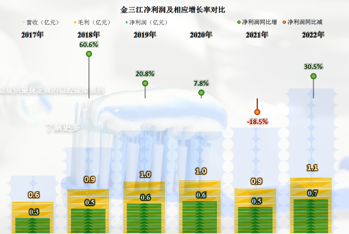 在净利润方面,2022年增长了30.5%,小于营收的增长幅度,近五年来,金三江的净利润增长有限,甚至在2021年还出现过较大幅度下降的情况。