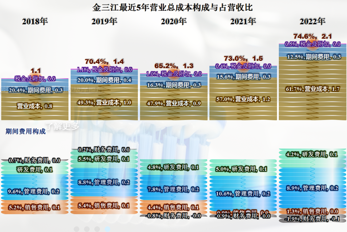 还好,近五年来,金三江都在通过降低期间费用来减轻毛利率下降的影响,特别是2022年期间费用下降达3.1个百分点,但是仍然没有抵挡住毛利率更大幅度下降的影响,总成本占营收比还是上升了1.6个百分点,盈利空间继续受到压缩。