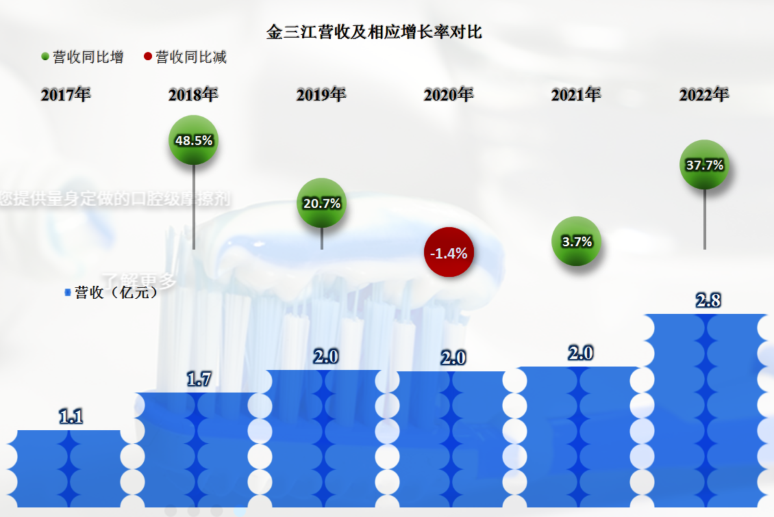 金三江在上市的当年,营收基本持平,实际上他们维持这一状态已经三年了,在蛰伏三年后,2022年总算迎来了大发展,营收增长了37.7%,达到了2.8亿元。