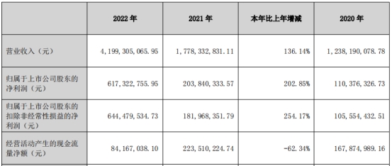2022年,兰卫医学实现营业收入41.99亿元,同比增长136.14%;实现归属于上市公司股东的净利润61732.28万元,同比增长202.85%;实现归属于上市公司股东的扣除非经常性损益的净利润64447.95万元,同比增长254.17%;经营活动产生的现金流量净额8416.70万元,同比下降62.34%。
