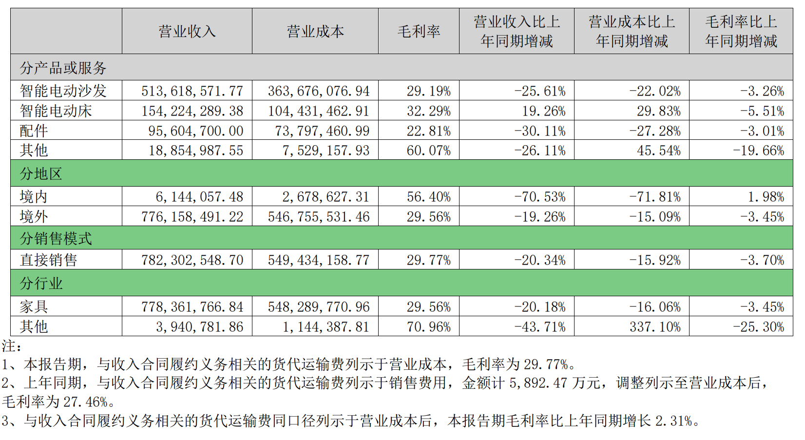 分产品来看,匠心家居智能电动沙发2022上半年营业收入为5.14亿元,毛利率为29.19%,毛利率比上年同期减少3.26%;智能电动床营业收入为1.54亿元,毛利率为32.29%,毛利率比上年同期减少5.51%;配件营业收入为9560.47万元,毛利率为22.81%,毛利率比上年同期减少3.01%;其他营业收入为1885.5万元,毛利率为60.07%,毛利率比上年同期减少19.66%。各项产品或服务毛利率均下滑。