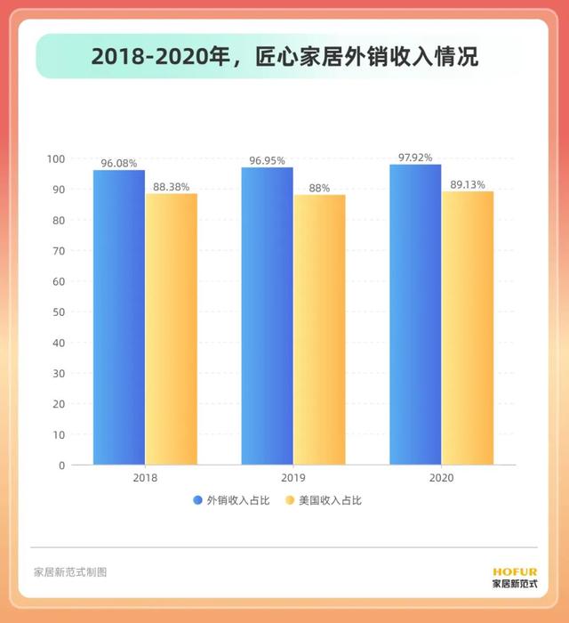去年9月,匠心家居在常州工厂总部举行“云敲钟”仪式,正式登陆深交所创业板。根据其招股书显示,2018-2020年,匠心家居外销收入占比分别为96.08%、96.95%、97.92%,其主营业务中美国收入占比又分别为88.38%、88%、89.13%,可见匠心家居的主要市场在美国。