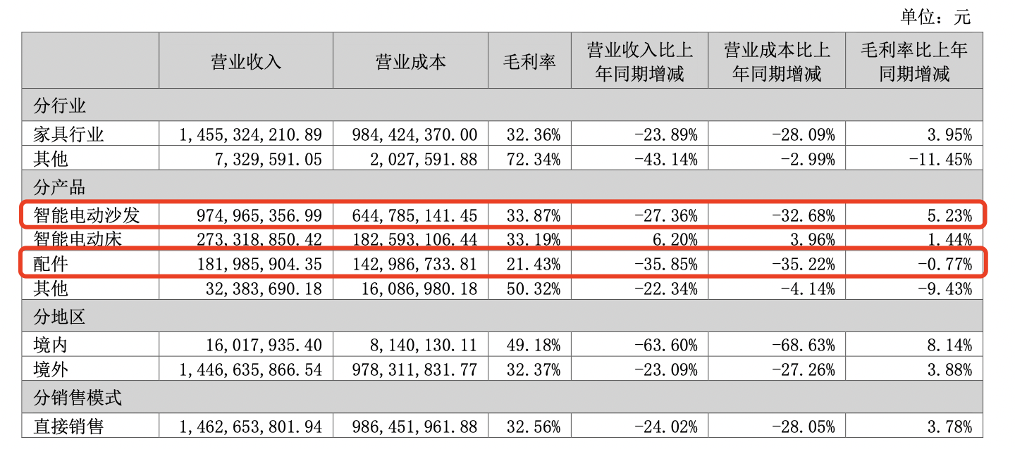 据悉,公司主要从事智能电动沙发、智能电动床及其核心配件的研究、设计、开发、生产、销售及服务。其中,2022年智能电动沙发的营收为9.75亿元,同比减少27.36%;配件的营收为1.82亿元,同比减少35.85%。