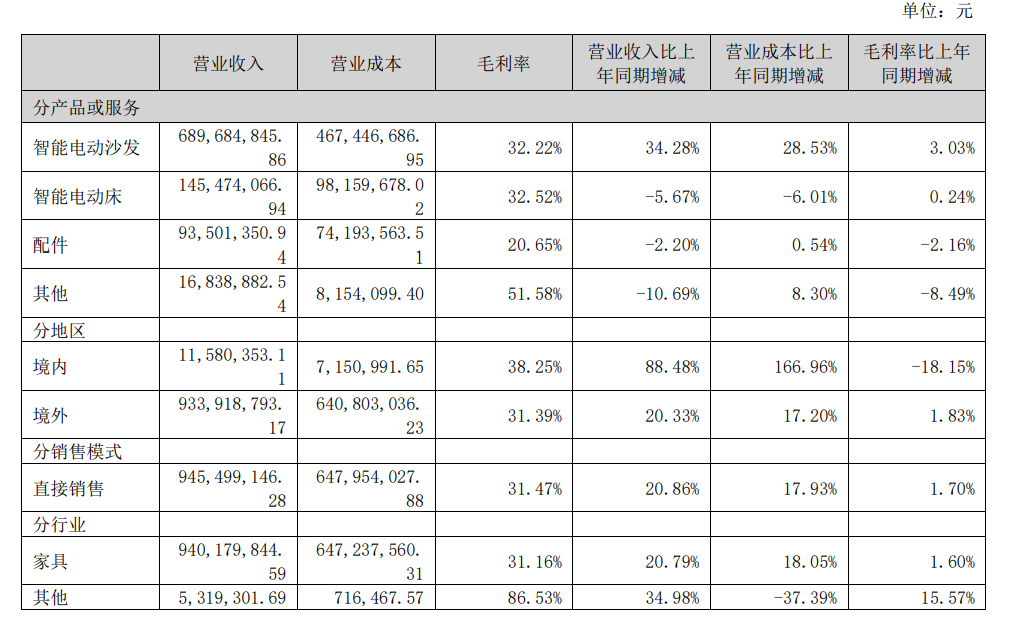 分产品来看,智能电动沙发产品营收6.9亿元,同比增34.28%;智能电动床营收1.45亿元,同比降5.67%;配件产品营收9350.14万元,同比降2.2%。