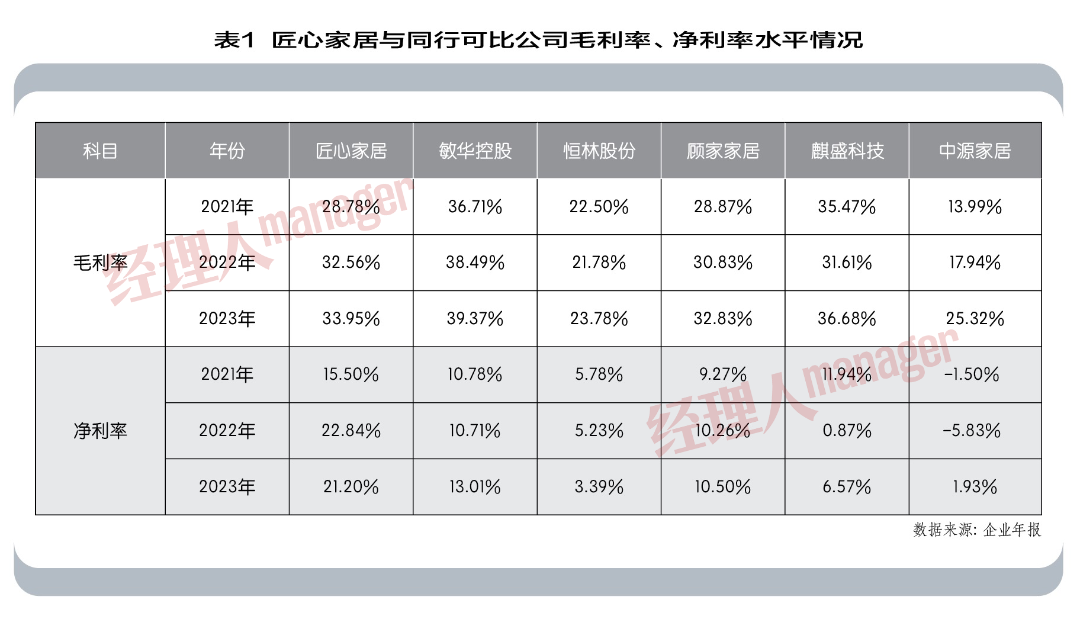 同期内,恒林股份的毛利率和净利率水平分别为22.50%、21.78%、23.78%,5.78%、5.23%、3.39%;顾家家居毛利率和净利率水平分别为28.87%、30.83%、32.83%,9.27%、10.26%、10.50%,二者净利率水平依然远低于匠心家居。