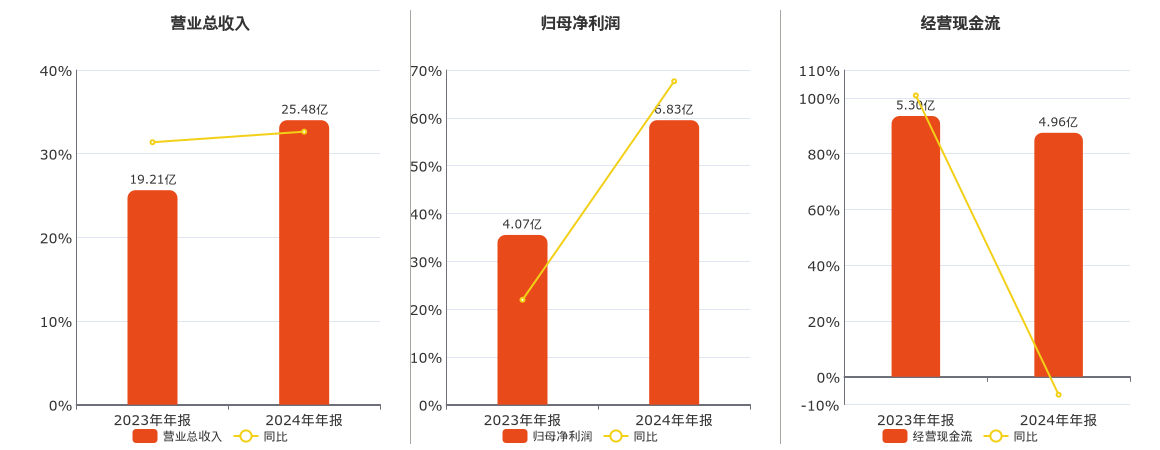 公司营业总收入为25.48亿元。归母净利润为6.83亿元。经营活动现金净流入为4.96亿元,较去年同报告期经营活动现金净流入减少3411.55万元,同比较去年同期下降6.44%。