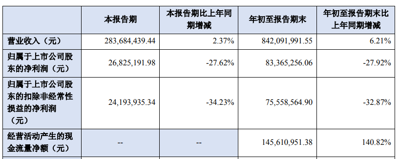 今年第三季度,上海艾录实现营业收入2.84亿元,同比增长2.37%;归属于上市公司股东的净利润2682.52万元,同比下降27.62%;归属于上市公司股东的扣除非经常性损益的净利润2419.39万元,同比下降34.23%。