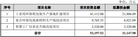上海艾录最终募集资金净额比原计划少2.04亿元。上海艾录2021年9月9日披露的招股书显示,公司拟募集资金3.11亿元,分别用于工业用环保纸包装生产基地扩建项目、复合环保包装新材料生产线技改项目、智慧工厂信息化升级改造项目。