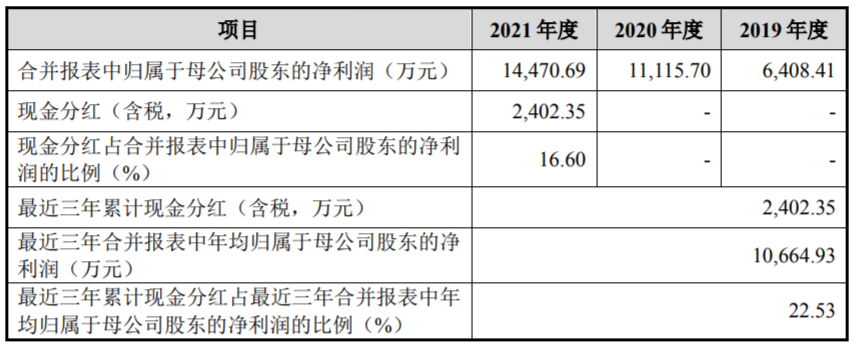 2019 年度和 2020 年度,上海艾录未进行利润分配。2022年5月20日,公司2021年年度股东大会审议通过了《关于公司 2021年度利润分配方案的议案》,以公司2021年12月31日总股本400,391,800 股为基数,向全体股东每10股派发人民币0.60元现金(含税),并于2022年6月10日实施完成,公司最近三年以现金方式累计分配的利润共计2,402.35万元(含税)。