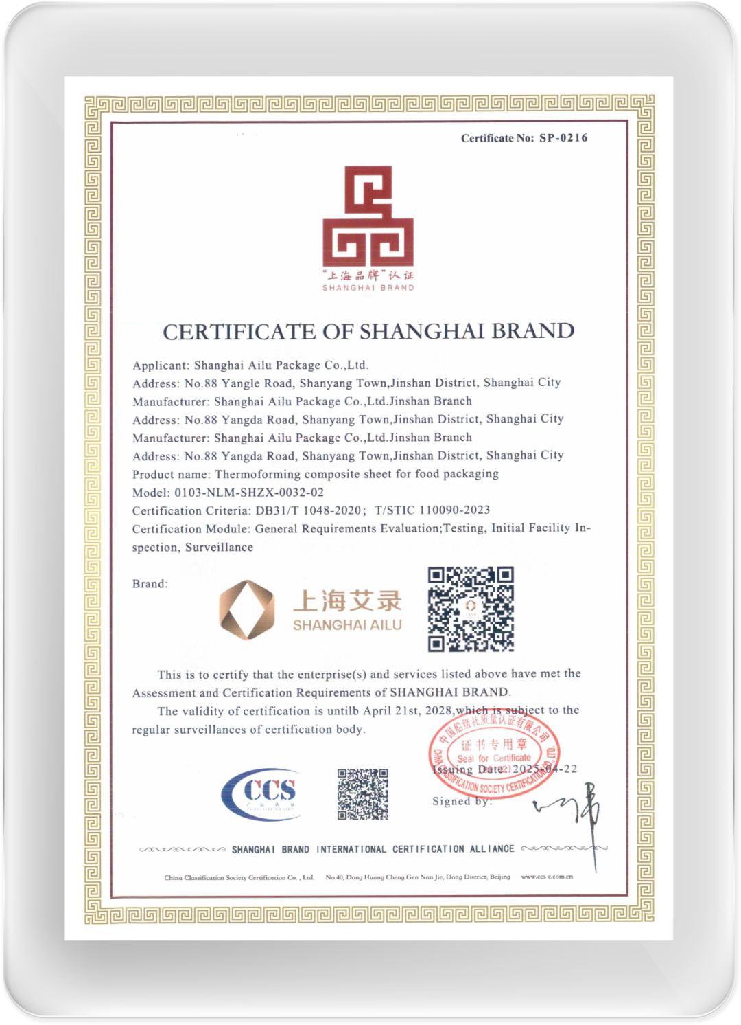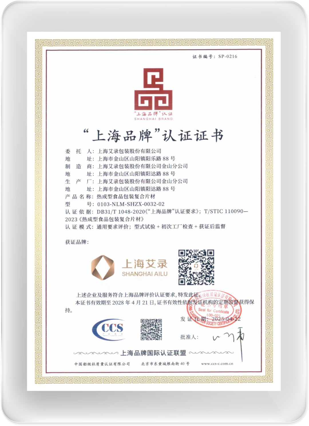 发布第8年,今年34家企业成功入选,上海艾录《热成型食品包装复合片材》获“上海品牌”产品认证,以“国内领先、国际先进”的卓越品质,在食品包装领域再获权威认可。
