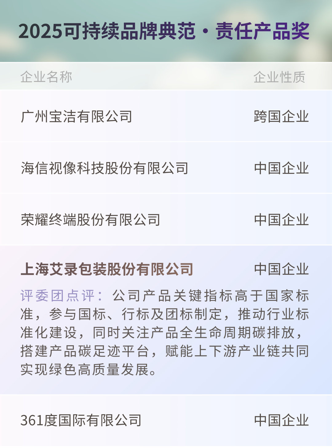 近日,知名科技和商业资讯平台虎嗅发布“2025可持续品牌典范”榜单。上海艾录凭借在可持续包装领域的长期投入与领先实践,成为本年度唯一获评“责任产品奖”的包装上市企业。