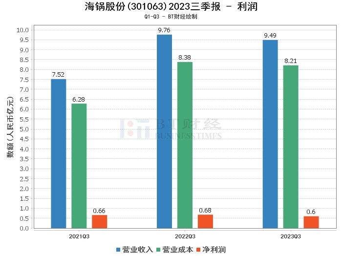 在利润方面,海锅股份2023年三季度的营业收入为9.49亿元,略低于上年同期的9.76亿元,下滑了2.75%。营业利润为6160.38万元,较上年同期的7312.97万元下降了15.77%。净利润为5979.18万元,较上年同期的6825.52万元下降了12.40%。公司的营业成本减少,从上年同期的8.38亿元减少到本期的8.21亿元,毛利率从上年同期的14.18%下降到本期的13.56%。