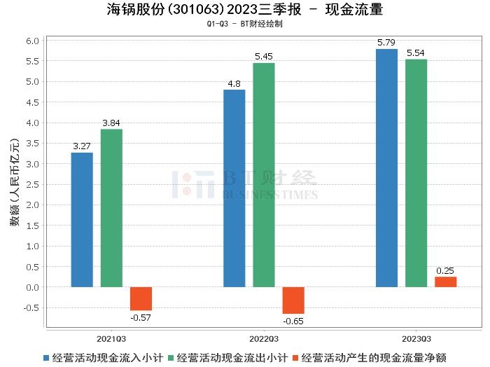 在现金流量方面,海锅股份2023年三季度的经营活动产生的现金流量净额为2493.39万元,较上年同期的-6534.03万元大幅增加138.16%。这主要得益于公司的经营活动现金流入增加,从上年同期的4.8亿元增加到本期的5.79亿元。