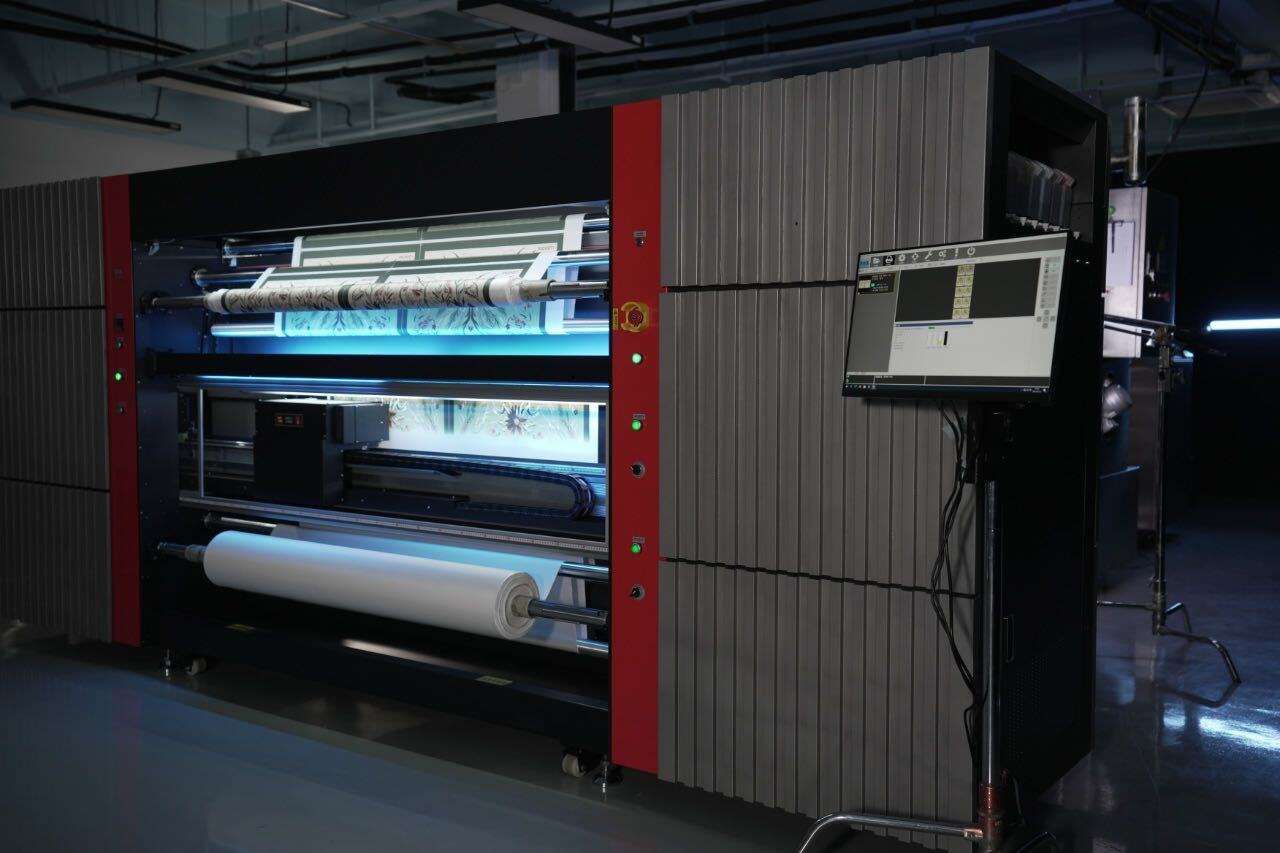 车间内,GBART免水洗印染一体机的运作更堪称“魔术”。传统印染车间里嘈杂的机械轰鸣声消失了,取而代之的是AI技术赋能下高精度计算软件和喷头的协作共鸣。当布料经过喷头,AI能精密计算出每一块花型面料微小分子所需的染料量,没有一滴多余。