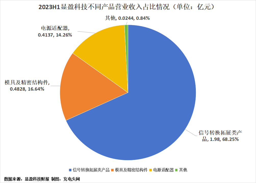 显盈科技2023H1信号转换拓展类产品营收1.98亿元,占总营收的比例为68.25%;模具及精密结构件营收0.4828亿元,营收占比16.64%;电源适配器营收0.4137亿元,占比为14.26%;其他营收0.0244亿元,营收占比0.84%。