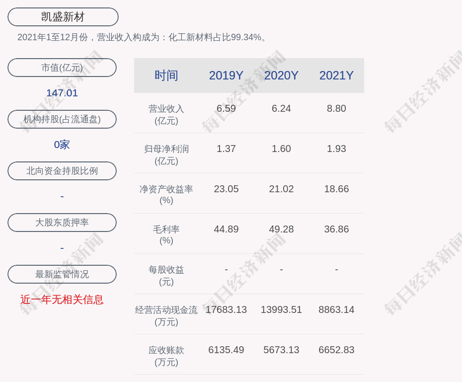 2021年1至12月份,凯盛新材的营业收入构成为:化工新材料占比99.34%。