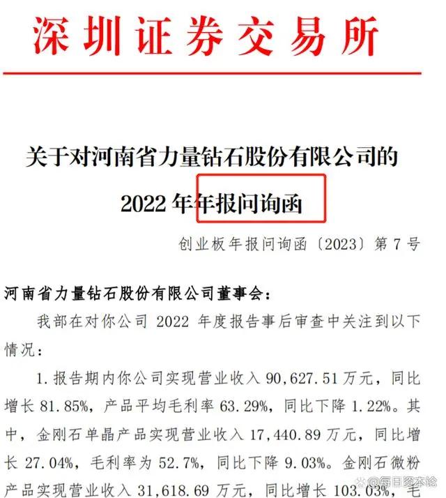 这绝对属于令人眼红的那种成绩单了。但3月23日,深交所就向力量钻石下发了年报问询函,追问10转8派10元方案与业绩成长性是否匹配,是否存在导致利益倾斜的关系或安排等25个问题,并要求3月31日前对外披露。