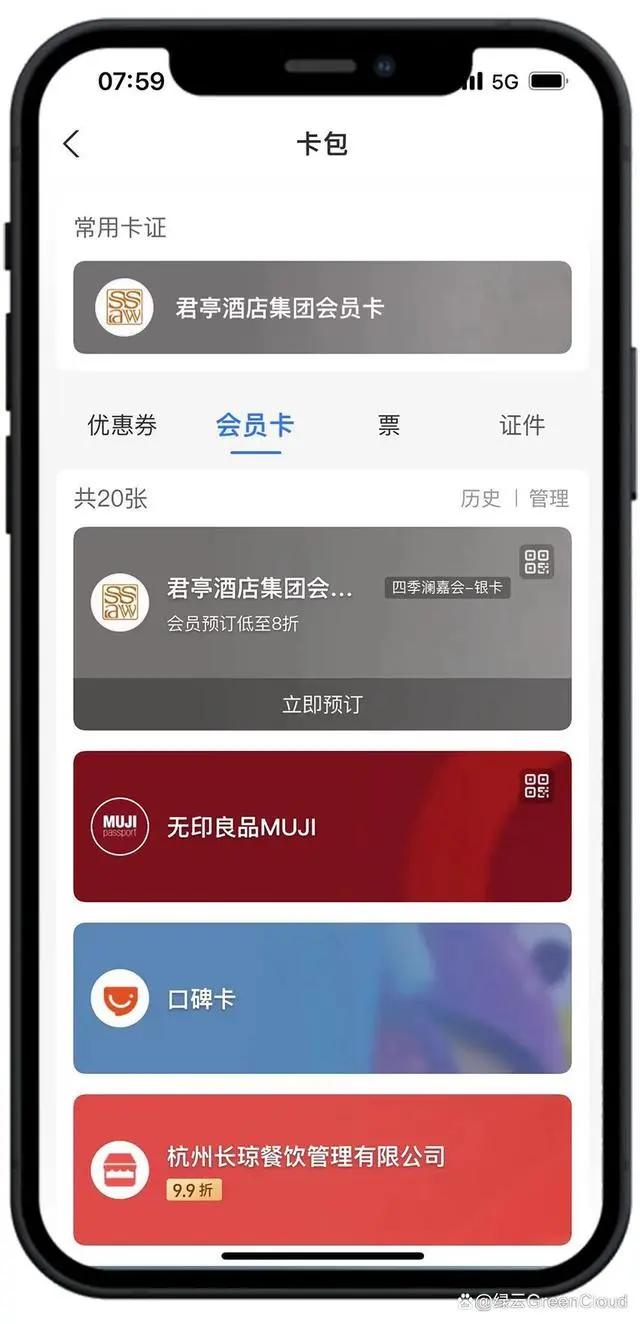 刷脸入会成功后,【四季澜嘉会】会员卡自动同步至支付宝卡包,在宾客需要时可通过卡包内会员卡直达君亭会员中心,通过君亭支付宝小程序预订享更多会员权益。