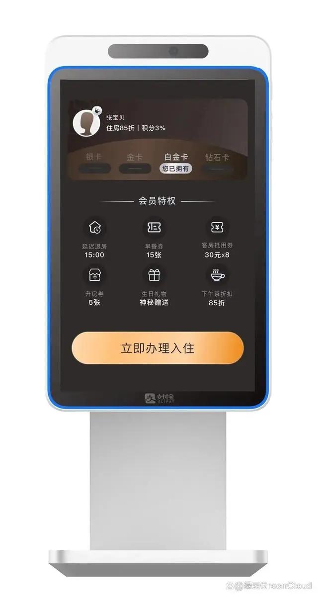 “刷脸入会”功能是绿云智慧住全链路解决方案中智慧前台的重要一环,宾客通过蜻蜓前台办理入住时,点击“刷脸入会”授权人脸,即可通过个人支付宝,会员等级自动匹配君亭酒店集团会员等级,注册成为会员即获取对应等级的会员卡。