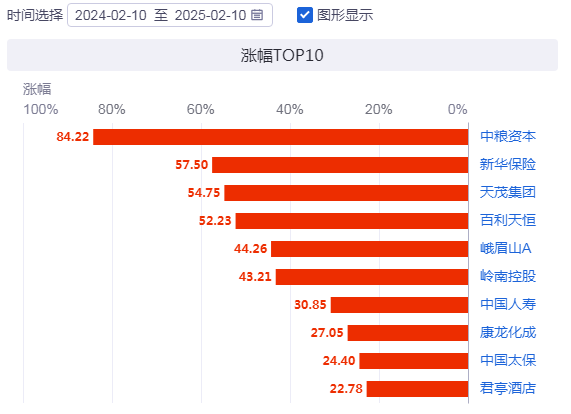 从市场表现看,近一年,位列涨幅榜前十的公司和区间涨幅分别是中粮资本84.22%,新华保险57.50%,天茂集团54.75%,百利天恒52.23%,峨眉山A44.26%,岭南控股43.21%,中国人寿30.85%,康龙化成 27.05%,中国太保 24.40%,君亭酒店 22.78%。