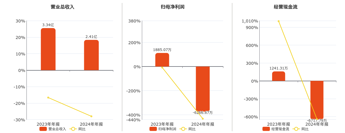 公司营业总收入为2.41亿元,较去年同报告期营业总收入减少9367.13万元,同比较去年同期下降28.02%。归母净利润为-6266.67万元,较去年同报告期归母净利润减少8151.74万元,同比较去年同期下降432.44%。经营活动现金净流入为-6717.79万元,较去年同报告期经营活动现金净流入减少7959.10万元,同比较去年同期下降641.19%。