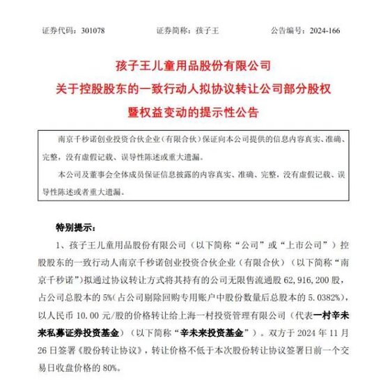 11月26日晚间,孩子王发布公告称,公司控股股东的一致行动人南京千秒诺创业投资合伙企业(有限合伙)(以下简称“南京千秒诺”)拟通过协议转让公司部分股权。