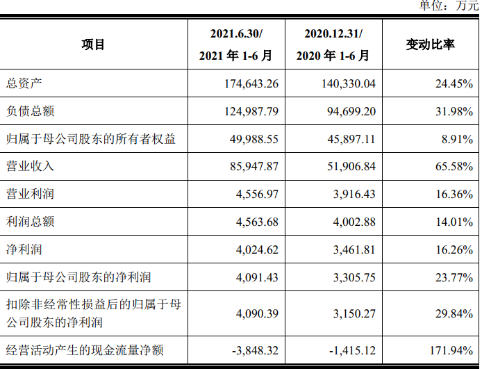 招股书显示,2021年1-6月,久盛电气实现营业收入8.59亿元,同比增长65.58%;归属于母公司股东的净利润4091.43万元,同比增长23.77%;扣除非经常性损益后归属于母公司股东的净利润4090.39万元,同比增长29.84%;经营活动产生的现金流量净额-3848.32万元,同比增长171.94%。