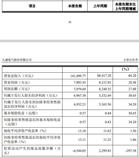 上市公告书显示,2021年1-9月,久盛电气实现营业收入14.19亿元,同比增长64.20%;归属于母公司股东的净利润6967.38万元,同比增长30.65%;扣除非经常性损益后归属于母公司股东的净利润6932.21万元,同比增长34.20%;经营活动产生的现金流量净额-4544.05万元,同比下降297.58%