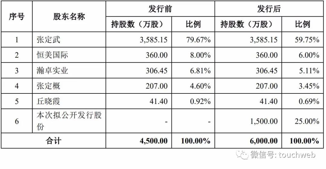 IPO后,张定武持股为59.75%,恒美国际持股为6%,瀚卓实业持股为5.11%,张定概持股为3.45%。