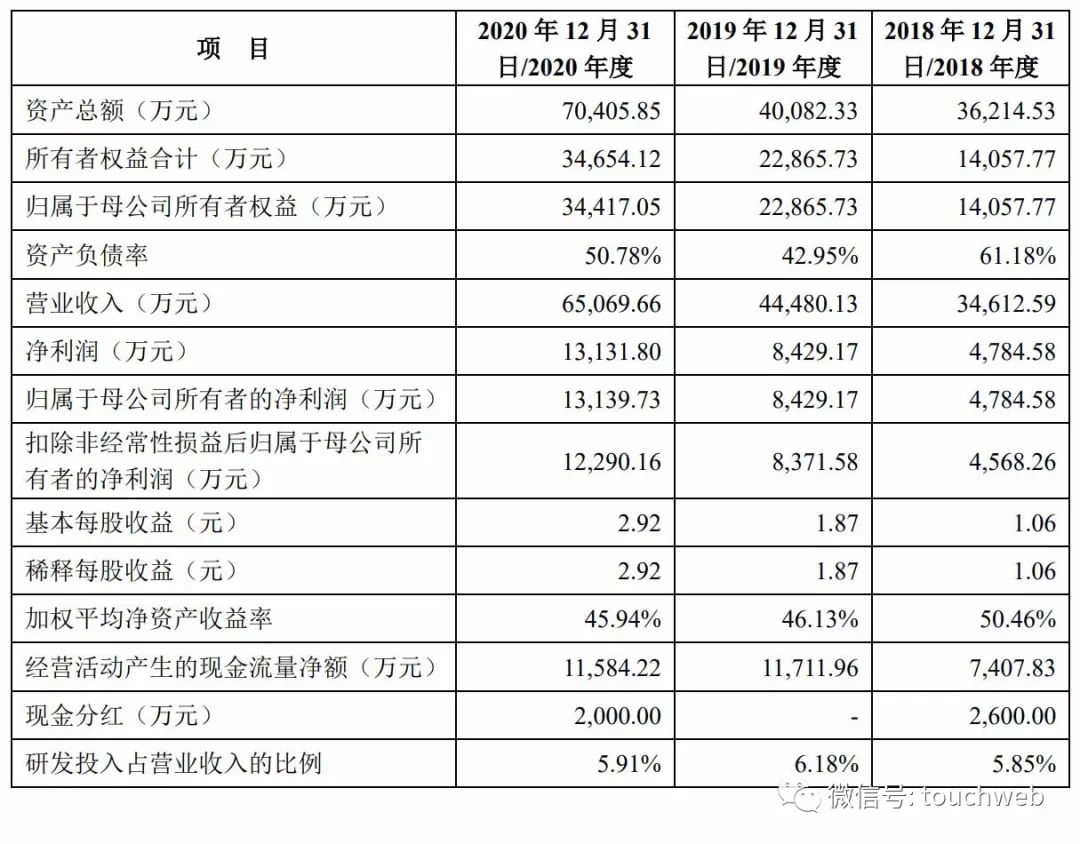 鸿富瀚2018年、2019年、2020年营收分别为3.46亿元、4.45亿元、6.5亿元;净利润分别为4784.58万元、8429万元、1.3亿元。